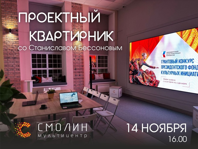 14 ноября в мультицентре «Смолин» пройдет первый в регионе «проектный квартирник». Поучаствовать могут авторы проектов, заполняющих заявки на текущий грантовый конкурс Президентского фонда культурных инициатив.